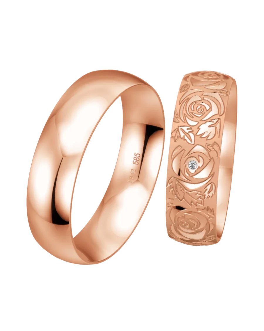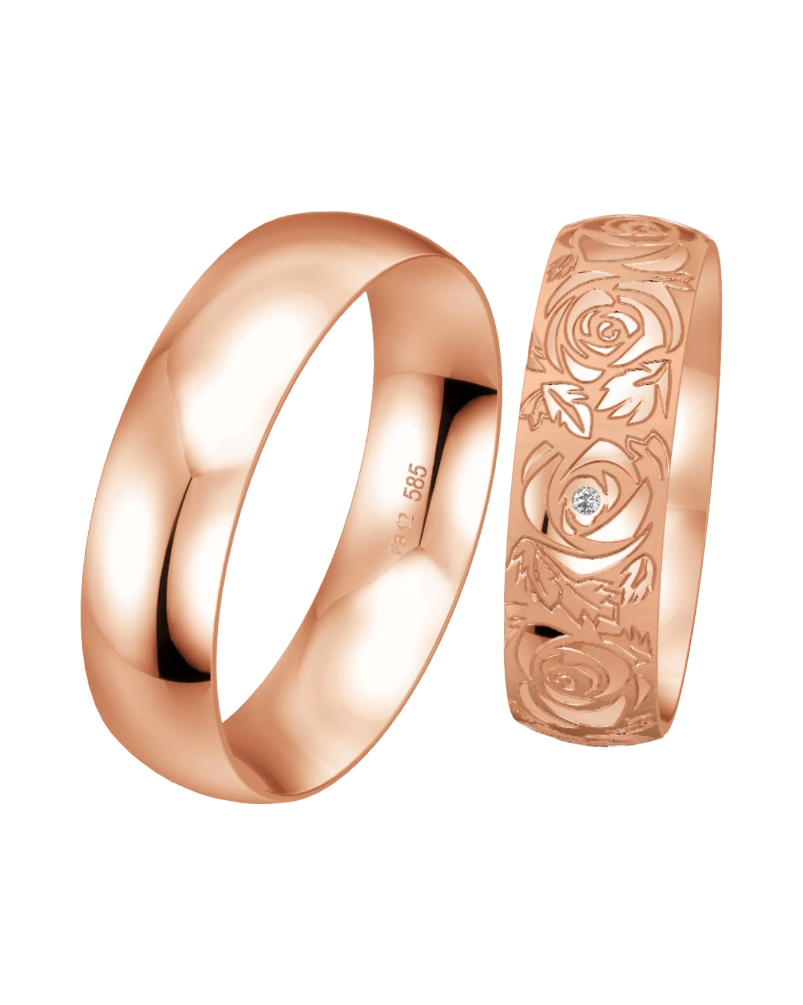 La collection Flower Breuning associe l’or 585 à un décor floral gravé ou ajouré, avec diamant sur certains modèles. Déclinée en or blanc, jaune ou rouge, elle propose des alliances au style plus ornemental, tout en conservant des lignes équilibrées et une belle lisibilité. L’ensemble exprime une approche élégante et travaillée, entre motif décoratif, finition soignée et éclat discret de la pierre.