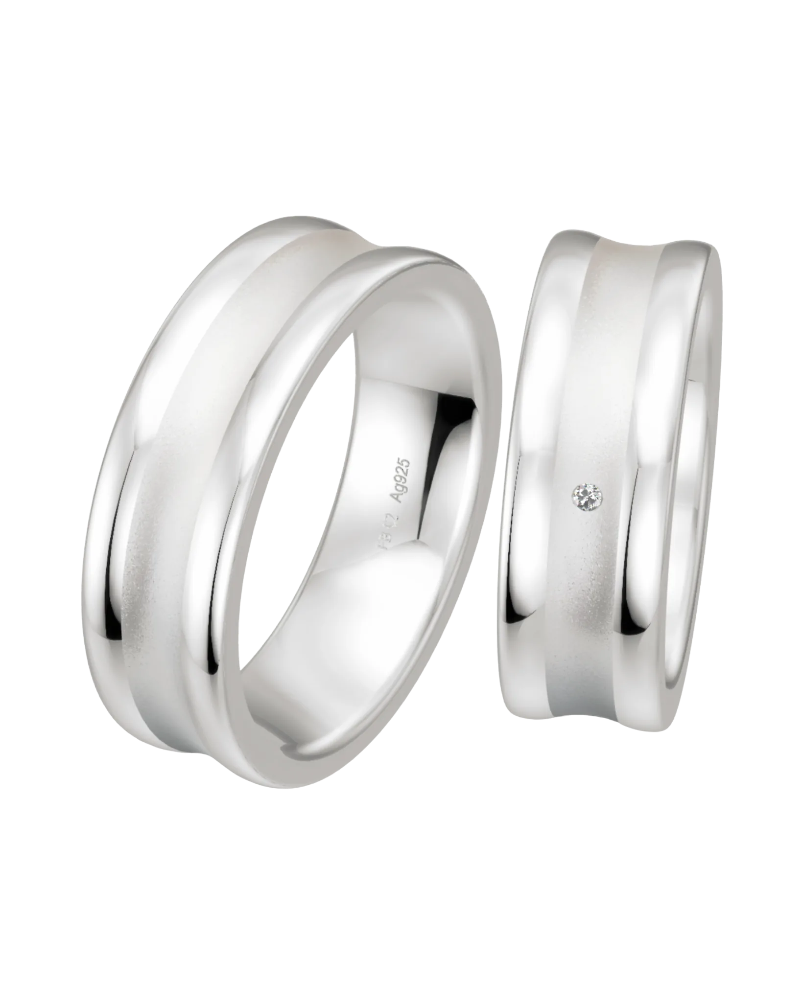 La collection Silver with Diamonds Breuning réunit des alliances en argent 925, avec diamant sur chaque modèle. Certains modèles associent l’argent à des détails bicolores, tandis que d’autres privilégient une ligne plus sobre et uniforme. L’ensemble propose un style contemporain, net et accessible, avec un équilibre entre finition satinée, formes simples et éclat discret de la pierre.