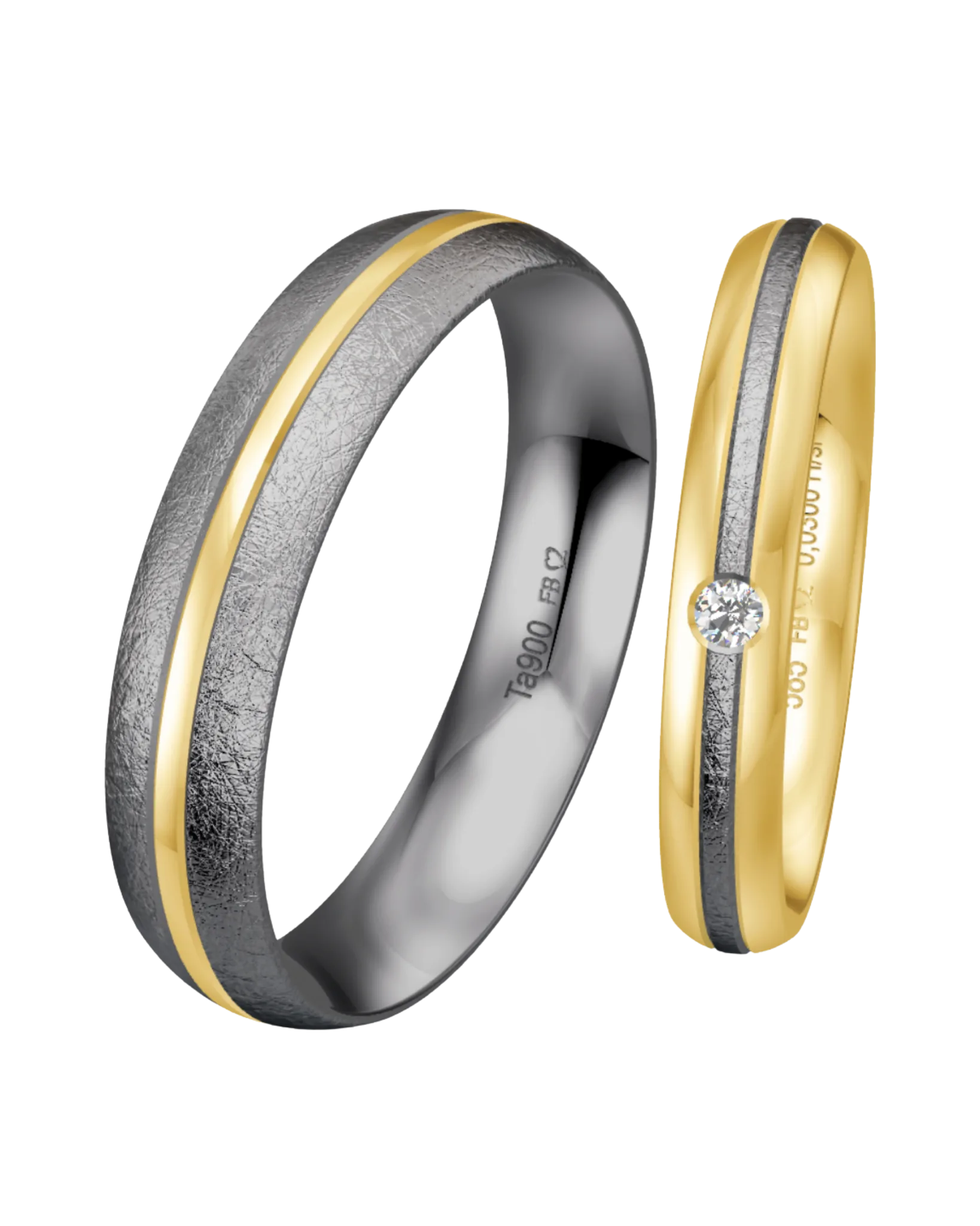 Alliance Breuning en or jaune 585 et tantale 900, finition polie et mate glacée, avec 1 diamant blanc de 0.03 ct.