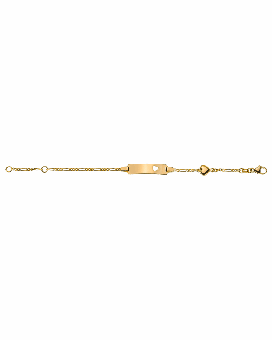 Bracelet Bébé Figaro 3+1 or jaune 375, 14cm, avec Plaque de gravure rectangulaire longue avec cœur perforé et motif cœur