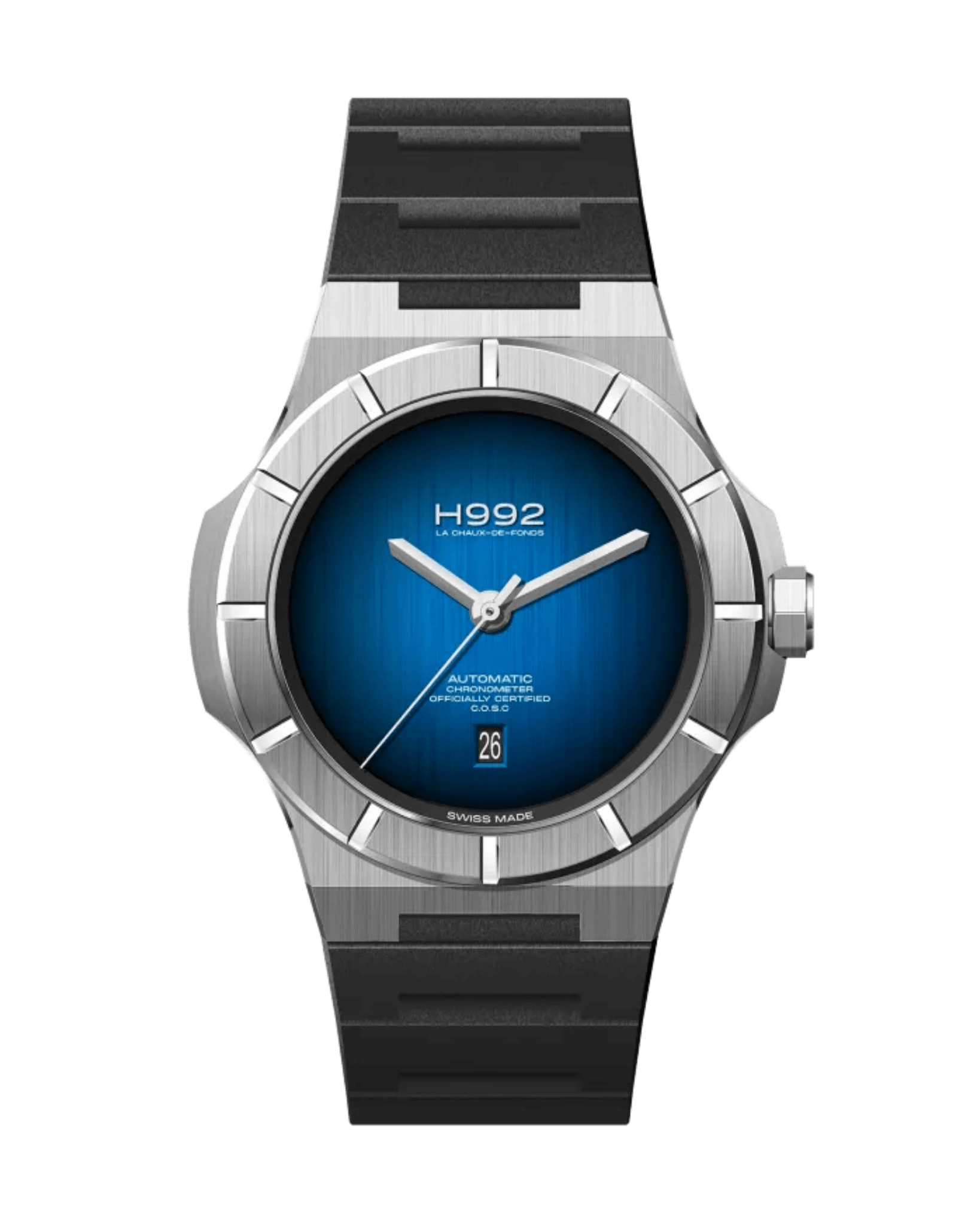 Montre automatique COSC H992 de 42 mm avec cadran dégradé, boîtier acier et bracelet Easy Change. Une création Swiss Made issue de La Chaux-de-Fonds.