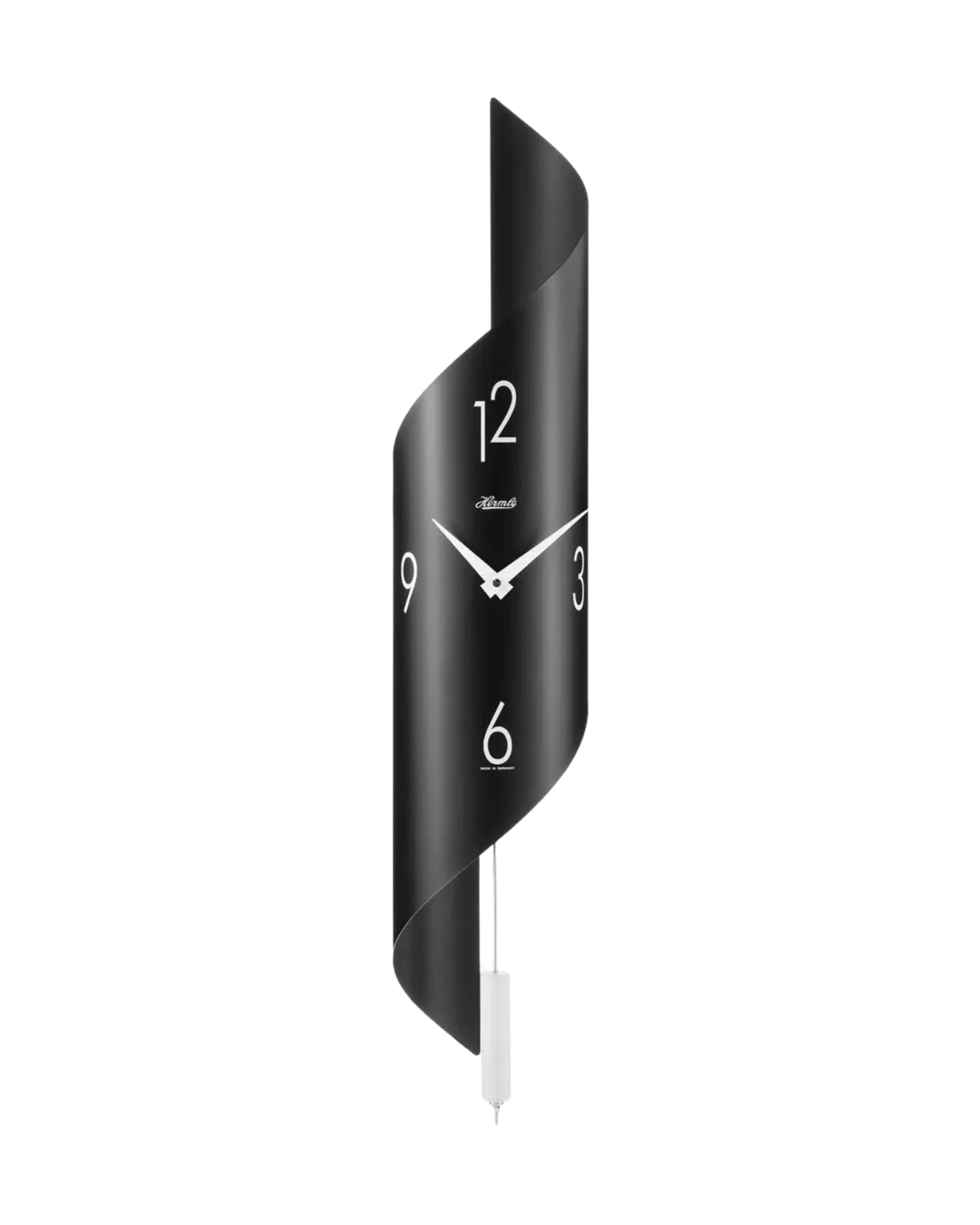 Le boîtier présente une forme dynamique et fluide, réalisée en acier inoxydable. Le cadran contrasté avec chiffres bien visibles s’intègre harmonieusement à l’ensemble. Le pendule cylindrique visible renforce l’élégance et l’équilibre visuel du modèle.