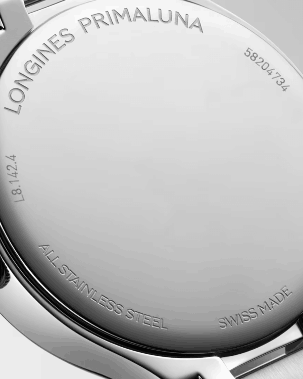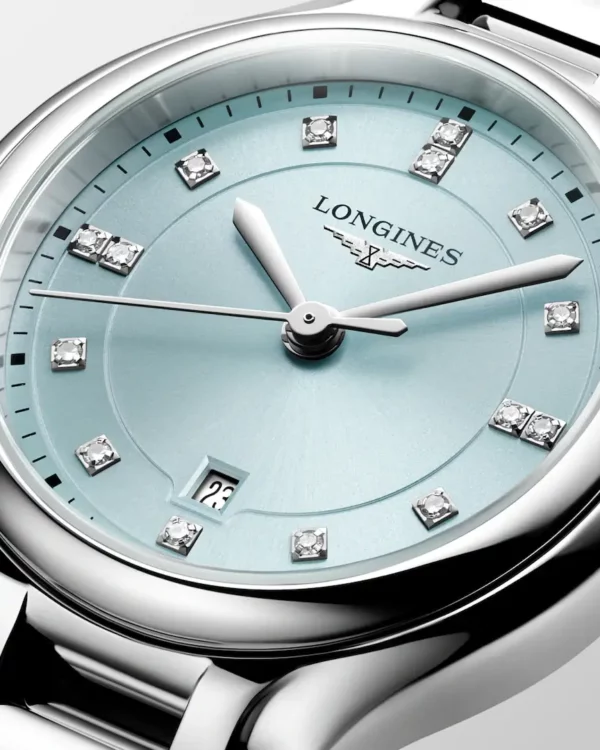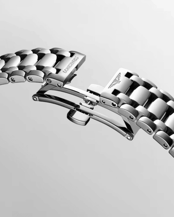 Animée par un mouvement quartz Longines calibre L257, cette montre assure une précision fiable au quotidien. La fonction de fin de vie de pile permet d’anticiper le remplacement de la batterie.