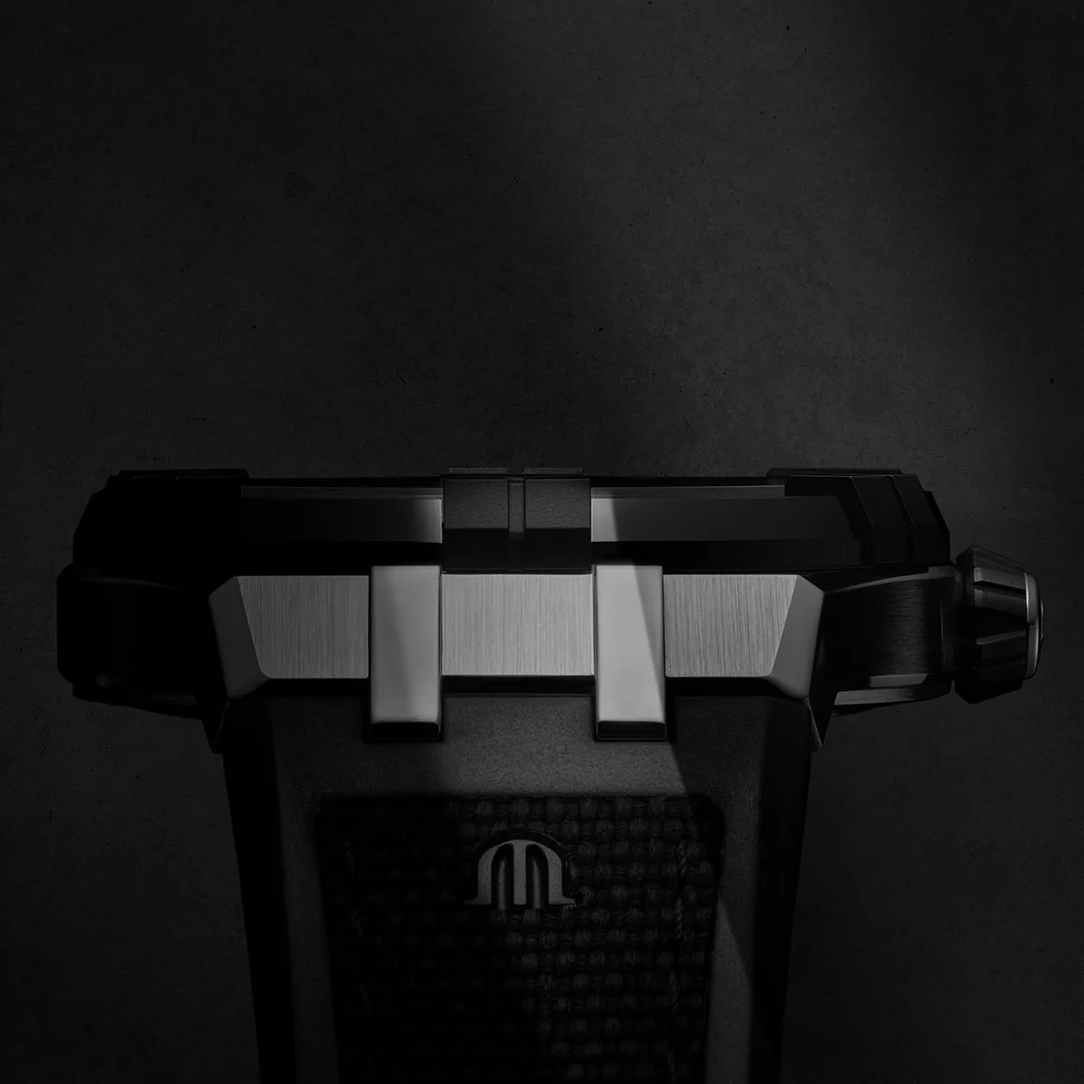 Le boîtier de 43mm présente une alternance de finitions brossées et polies. La lunette en céramique avec ses six griffes distinctives souligne le caractère de la collection. Le cadran noir à effet carbone assure une lisibilité optimale grâce à ses index appliqués et ses aiguilles luminescentes.