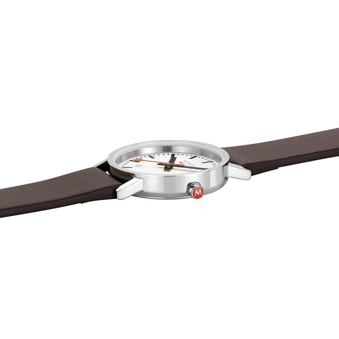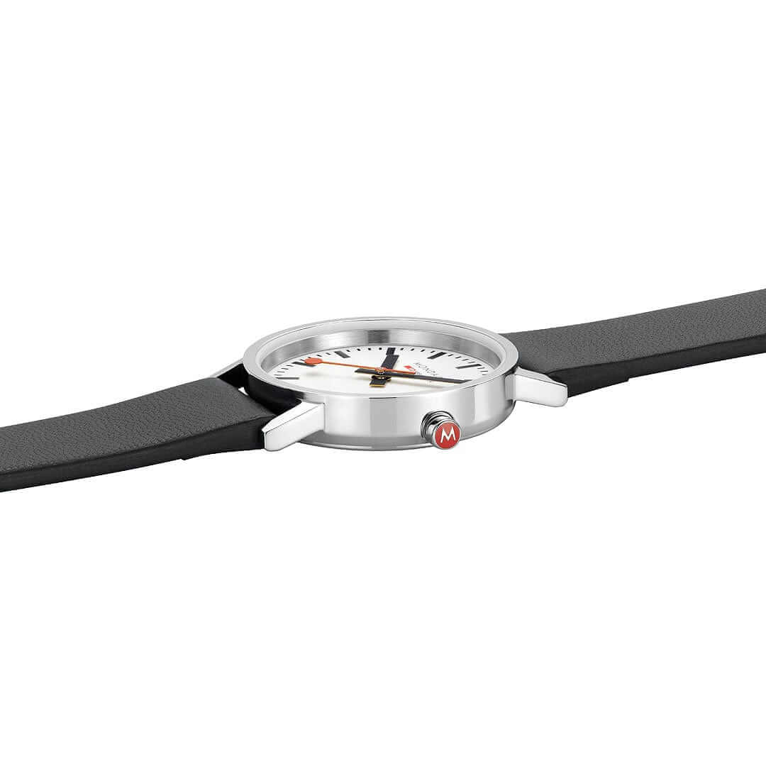 Son boîtier rond de 30 mm en acier inoxydable poli accueille un cadran blanc épuré à la lecture immédiate. La couronne rouge iconique, signature de Mondaine, apporte une touche distinctive. Son épaisseur contenue de 7 mm assure un porté discret et confortable au quotidien.