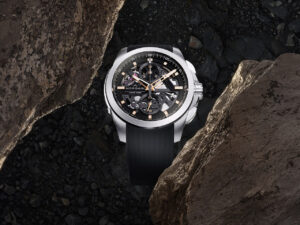 Le boîtier de 42 mm est façonné en titane grade 5 avec un revêtement DLC noir pour une résistance supérieure. Le cadran squeletté noir satiné est rehaussé d’un anneau minute jade green et d’index appliqués diamant-cut plaqués gun metal, remplis de Super-LumiNova® X1.