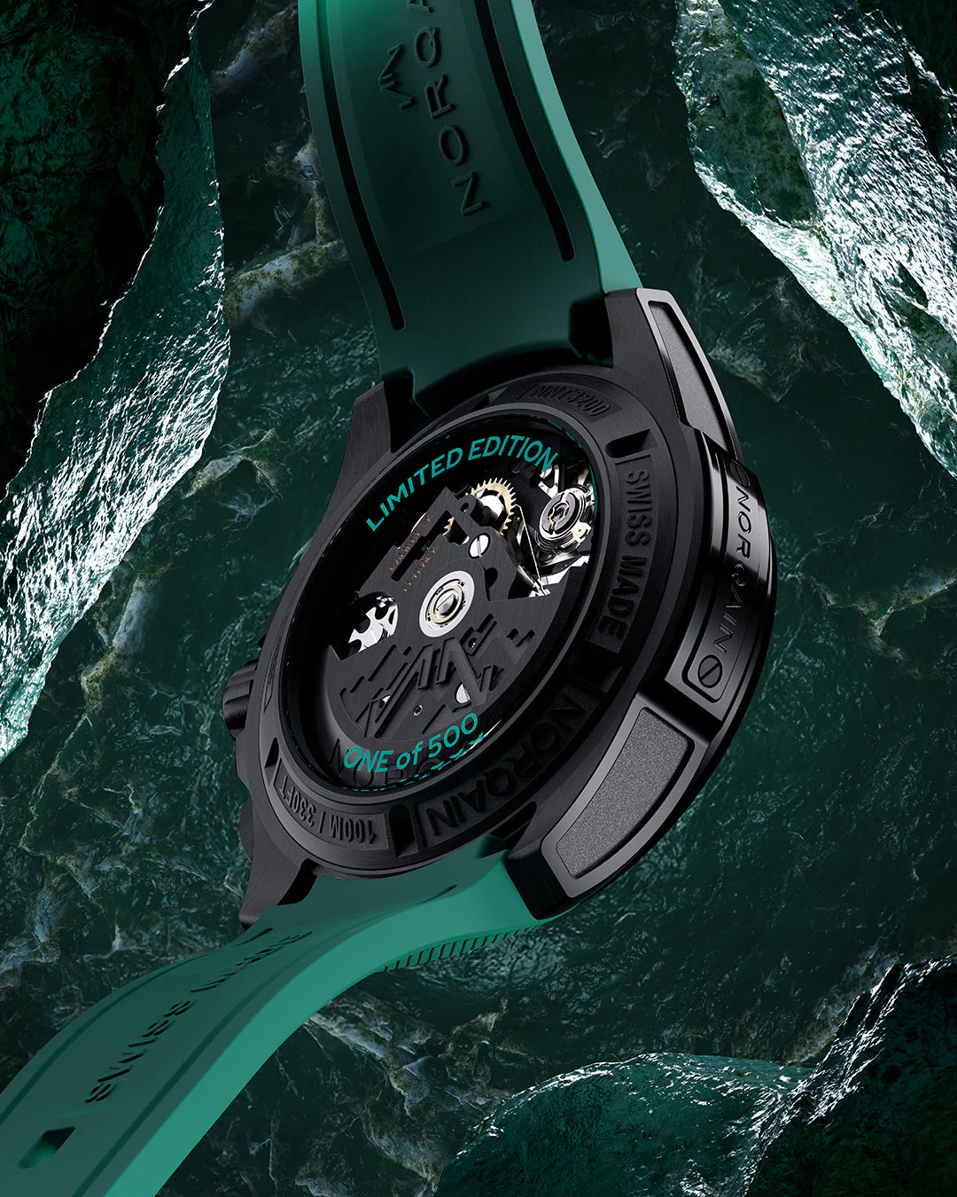 Le fond transparent en saphir révèle la gravure “LIMITED EDITION ONE of 500” en vert jade.