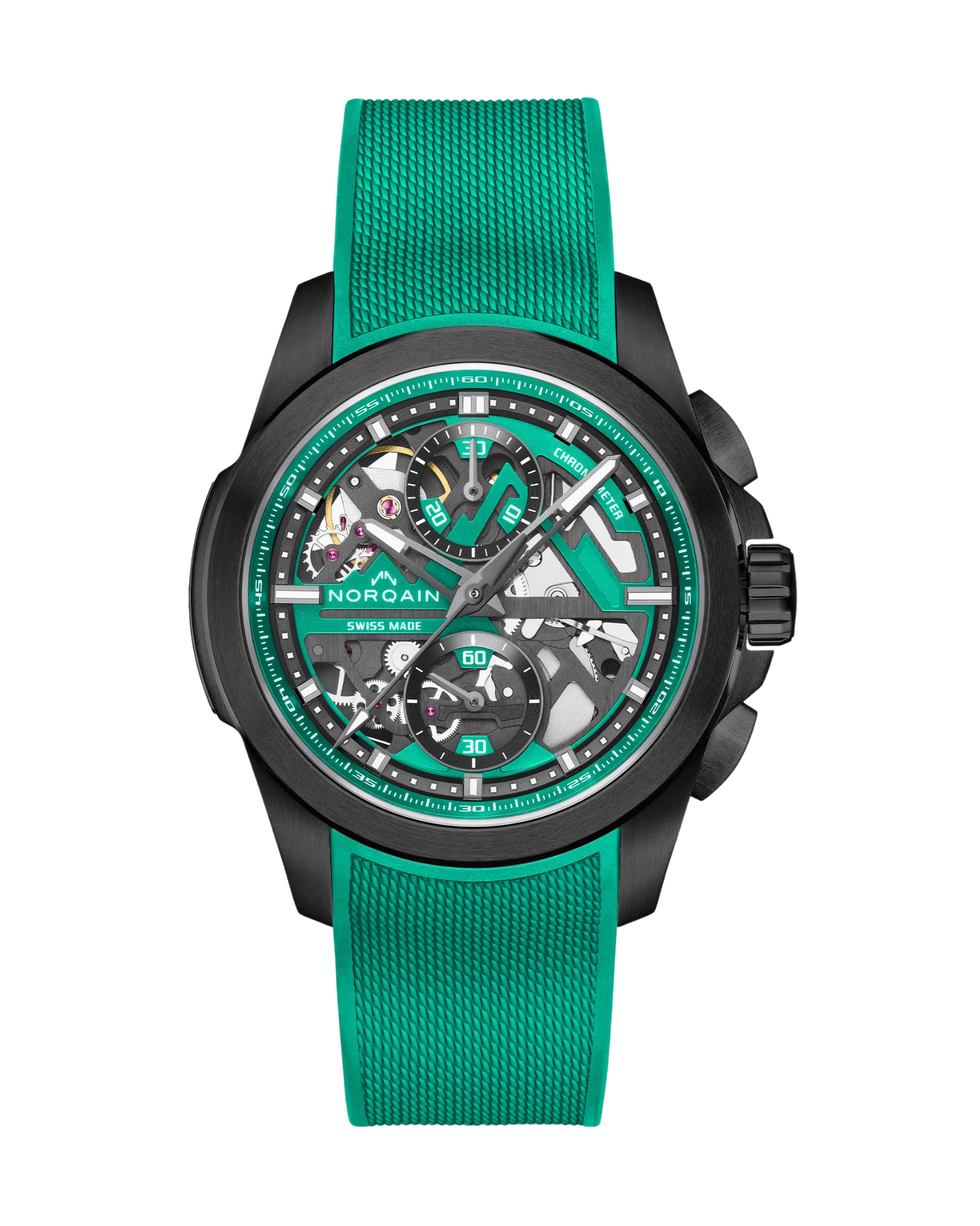 La Norqain Independence Skeleton Chrono 42mm Limited Edition incarne l’alliance entre haute performance mécanique et design contemporain. Limitée à 500 exemplaires dans le monde, cette montre est propulsée par le calibre manufacture Norqain 8K, un mouvement squelette flyback chronographe certifié COSC. Son esthétique unique en titane DLC et ses accents jade green rappellent la pureté et la puissance des plus hauts sommets.