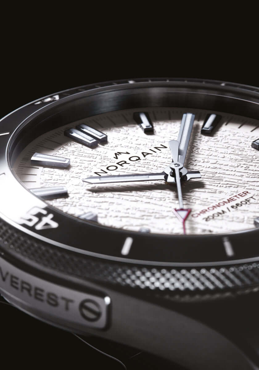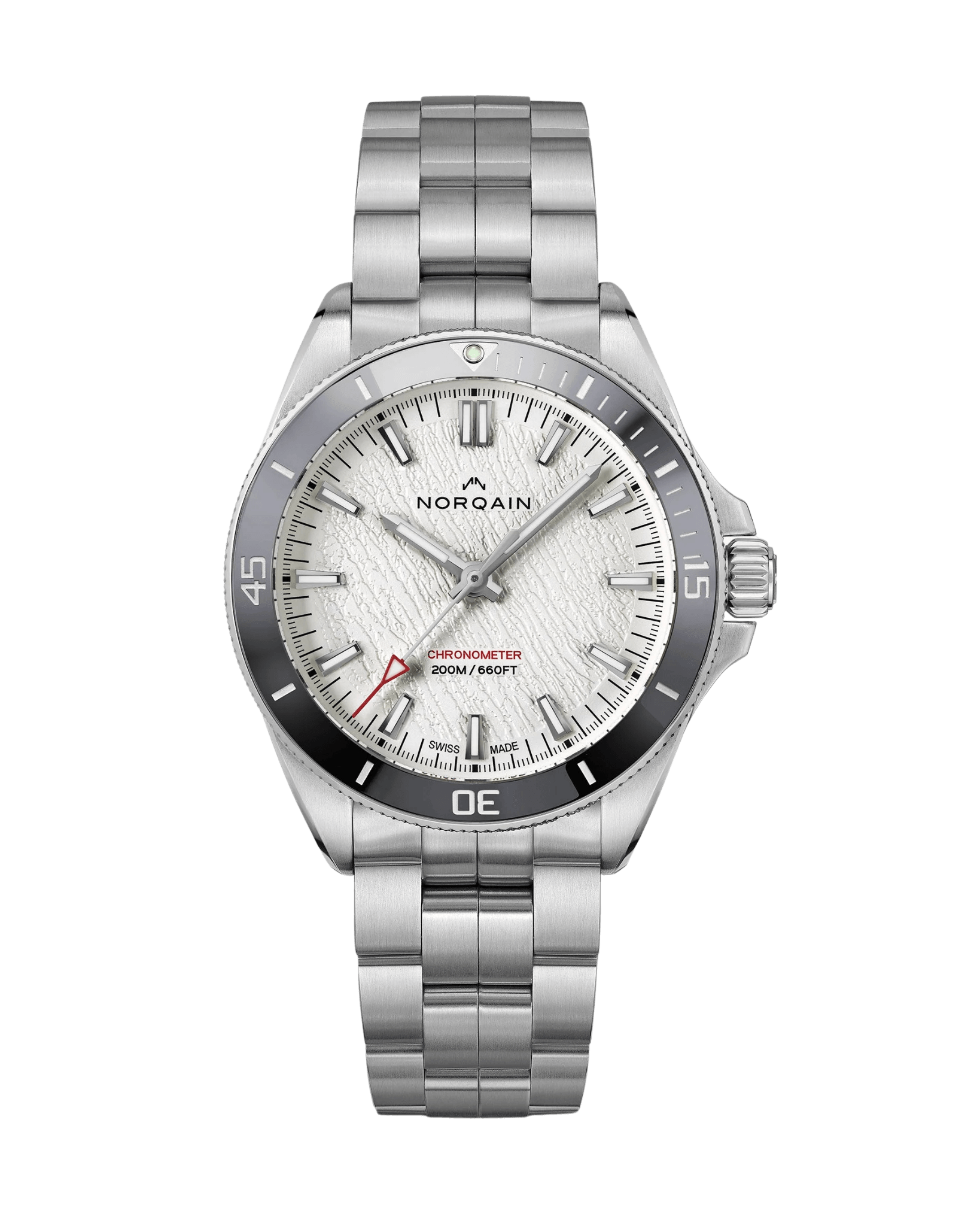 La NORQAIN Neverest Glacier 40mm incarne l’esprit d’aventure et d’indépendance cher à la maison NORQAIN. Issue de la collection NEVEREST, cette montre rend hommage aux sommets himalayens à travers un cadran blanc texturé évoquant les crevasses du Khumbu Icefall. Une partie des ventes de cette collection soutient le Butterfly Help Project au Népal.
