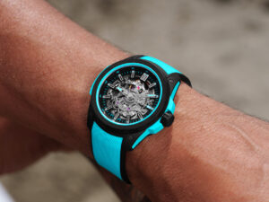 Le fond et le conteneur sont réalisés en titane sablé, tandis que la couronne vissée est surmoulée de caoutchouc noir et ornée du logo NORQAIN. Le tout ne pèse que 78 grammes, grâce à l’utilisation de matériaux de pointe et au mouvement squeletté automatique NORQAIN N08S.