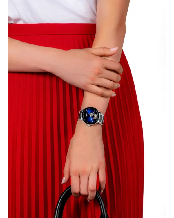 Chaque modèle présente un boîtier de 39,5 mm protégé par un verre saphir inrayable. Les index bâtons appliqués et les aiguilles assorties assurent une lecture claire. Le design fluide du boîtier et du bracelet intégré garantit confort et équilibre visuel.