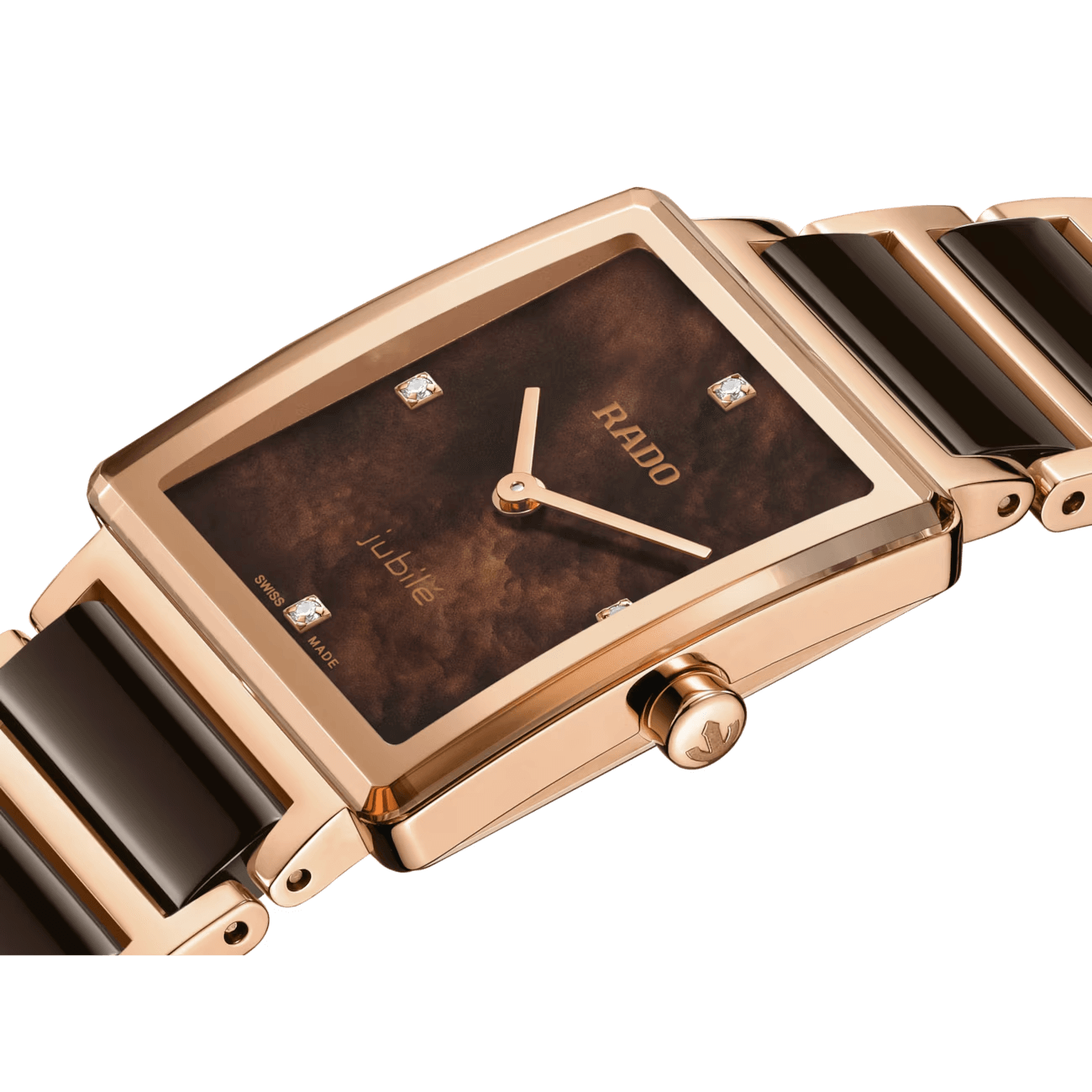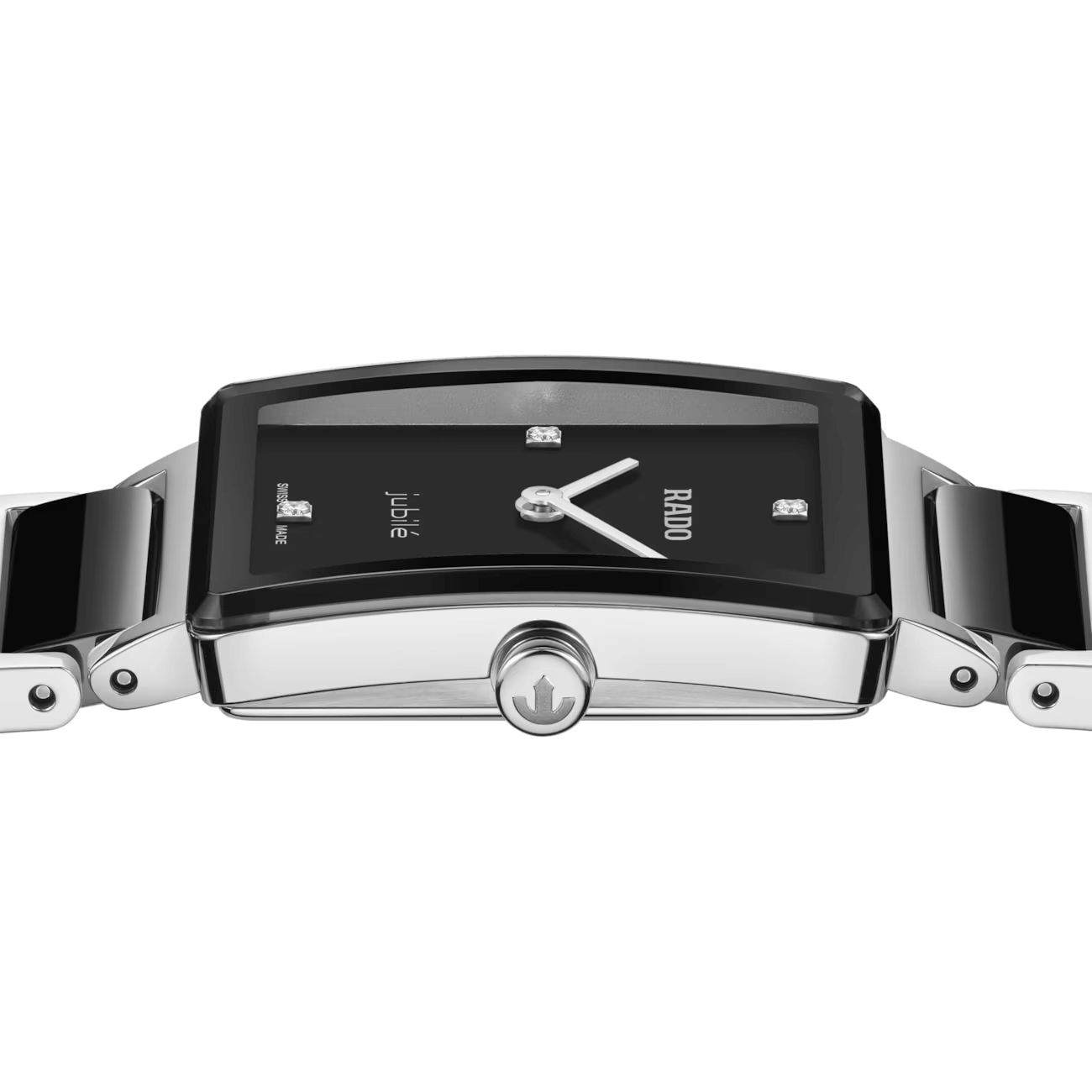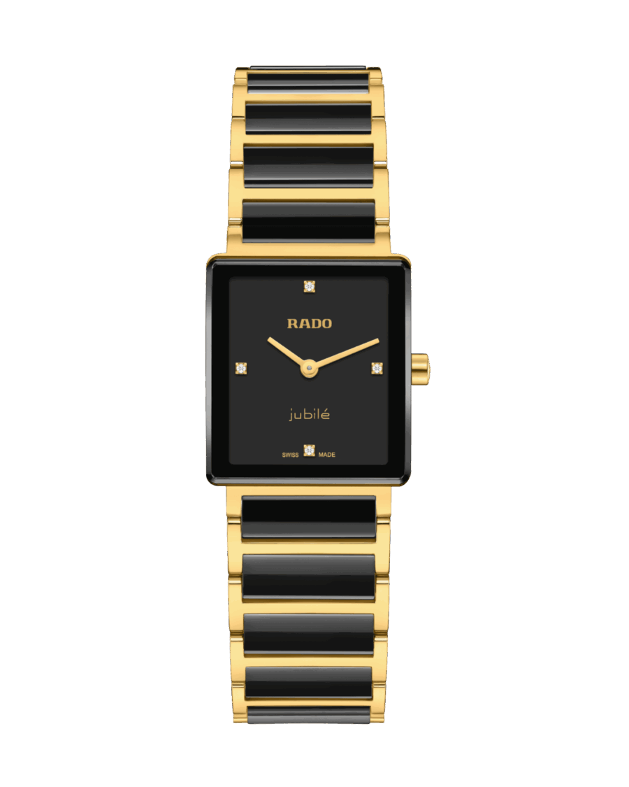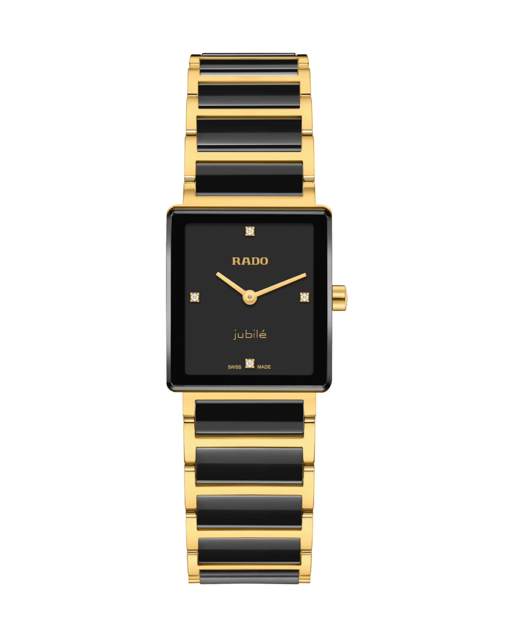 Le boîtier en acier inoxydable avec traitement PVD présente des lignes nettes et une finesse accentuée par l’épaisseur de 6.35 mm. Le cadran noir laqué accueille quatre diamants sertis, associés aux logos Rado et Jubilé. Le verre saphir bord-à-bord, galbé et traité antireflet, renforce la lisibilité tout en créant une transition fluide avec le bracelet en acier et céramique haute technologie.