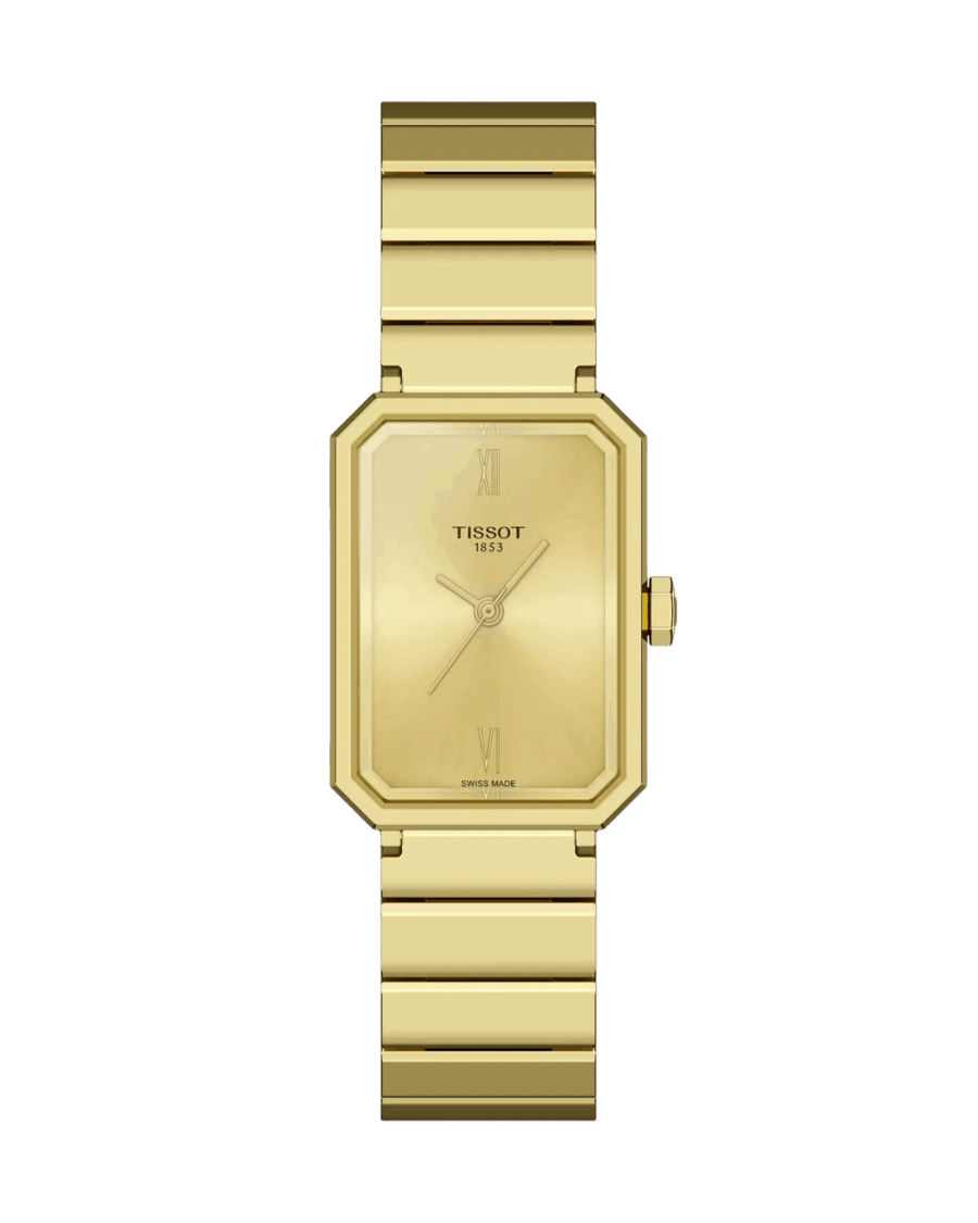 La Tissot SRV — PVD or jaune reprend le design rectangulaire caractéristique de la collection SRV dans une version lumineuse et sophistiquée. Inspirée de l’esthétique Art déco des années 1920, elle séduit par son boîtier PVD or jaune, son cadran champagne et son bracelet métallique assorti. Derrière son apparente simplicité se cache tout le savoir-faire horloger suisse, alliant précision, élégance et confort.