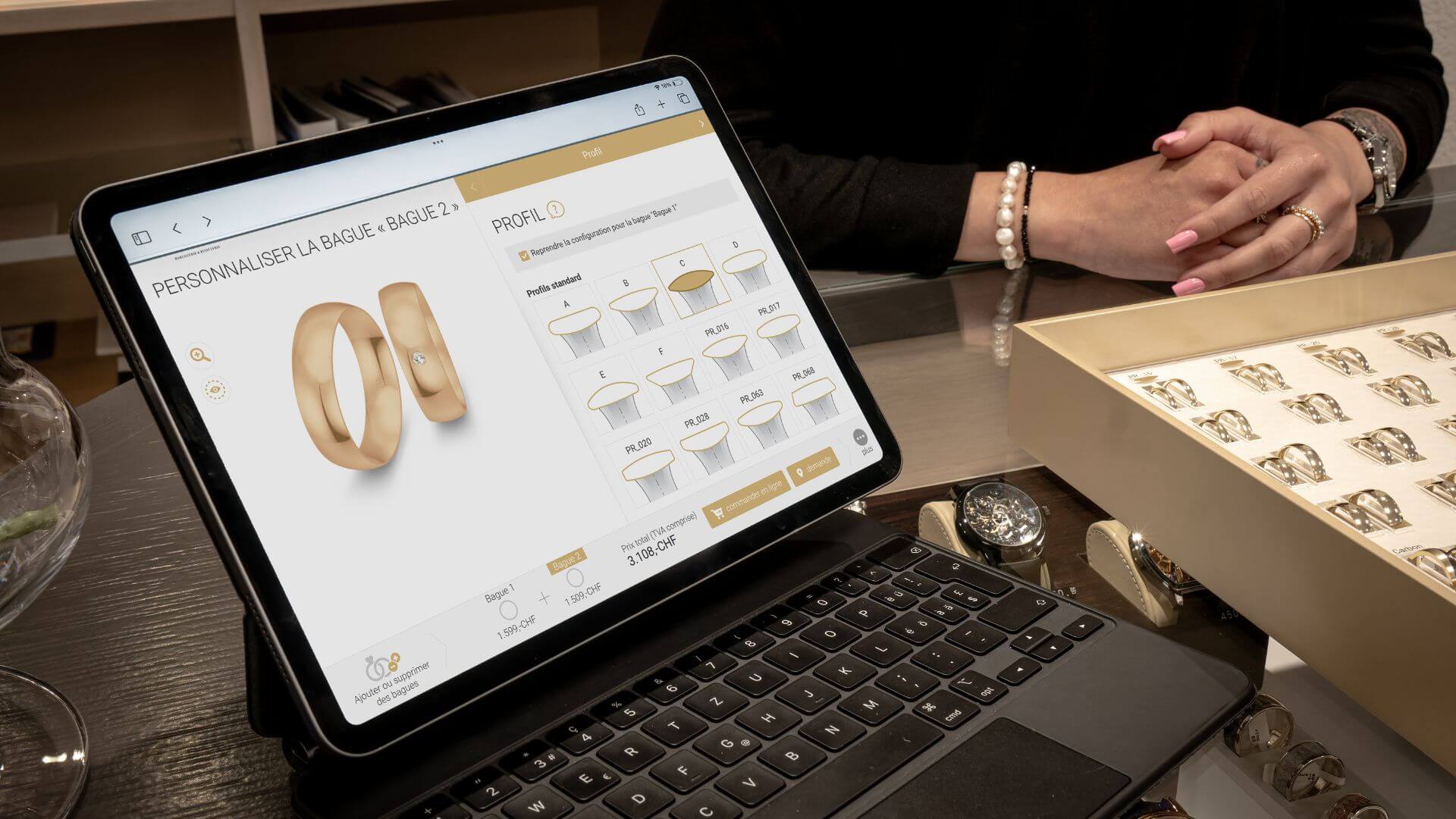 Accédez au configurateur, sélectionnez le profil, la largeur, les matériaux, les pierres… et ajoutez une gravure si vous le souhaitez.