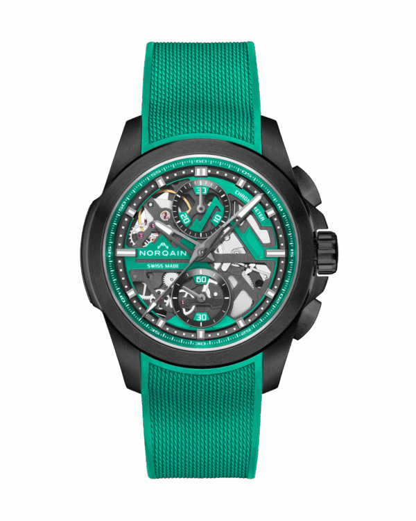 La NORQAIN Independence Skeleton révèle son mouvement manufacture ajouré à travers un cadran entièrement ouvert.